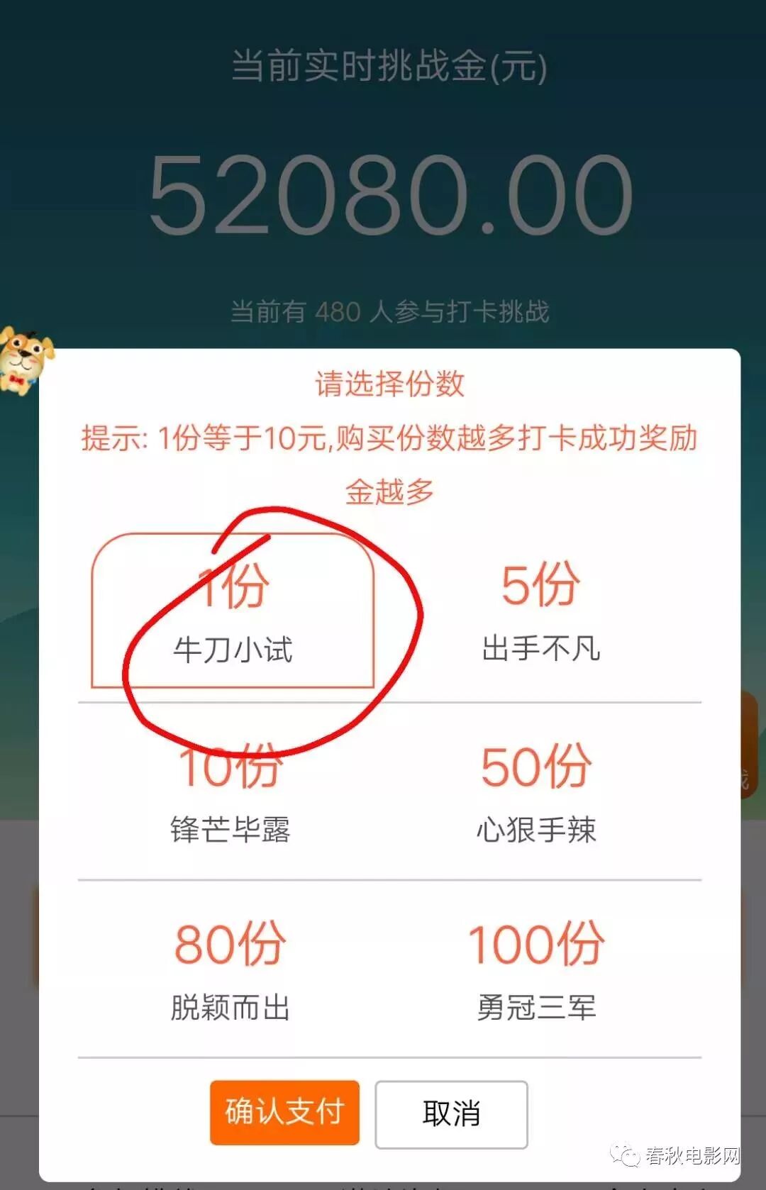第三步 :进入主页面后,会出现以上图片,点击 参与挑战 ,界面会跳转到支付页面, 选择参与分 数 。