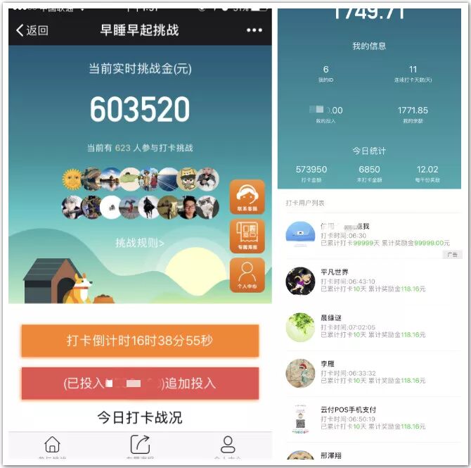 准时打卡用户,按等份瓜分未打卡用户挑战金,忘记打卡后,挑战金即被瓜分,再次参与需重新支付挑战金;