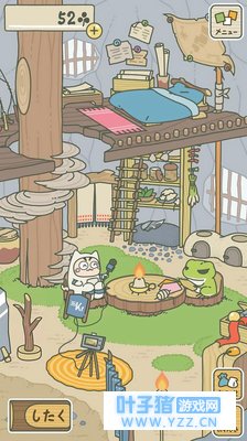 率先映入眼帘的是蛙蛙的庭院,眼前那短树桩圈起的土地里种植着的三叶草便是游戏里的“钱”了。你用它可换置蛙蛙旅行所需的食物和道具。与疯狂“掏空”你腰包的李泽言们不同,三叶草庭院里自己就会生长,连种植步骤都免了。当然,多金玩家左上角氪金按钮走好。