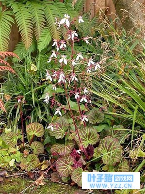 在南天竹和玉簪中间的是 虎耳草 的品种,它曾经是单独的一个种,然而人们将它先是降级为虎耳草的变型,现在更是将这个种处理成了虎耳草的品种。这个类型在游戏里表现得很传神——中国常见栽培的虎耳草叶片上只有有白色脉纹,而日本常见的这个类型在叶片的白色脉纹之间还有红色的斑纹。