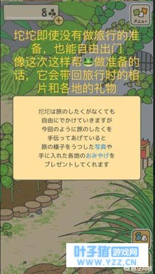好了基本教程就到这里结束了,感谢贴吧的大神翻译! 写在最后 刚开始玩不知道为什么觉得没啥意思,后来跟着攻略昨晚引导教程,才发现这个游戏真的很走心,在玩的过程中,等待青蛙的归来,好像在等待自己的孩子一样,会担心他在旅行中会不会遇到危险,会不会食物不够吃,当收到它寄回来的照片和特产的时候特别开心,突然就想到了自己的父母。 可能有点矫情了,这个游戏个人感觉真的很走心,特别是青蛙吃饭的样子,我可以看一整天,哈哈哈。没有玩过的朋友可以下载去玩玩,真的很有意思