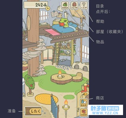 花园:回到花园 帮助:一些基本用不到的设定项 部屋(收藏夹):观看蛙旅行带回来的物品和照片 准备:帮蛙准备旅行用品的地方(重要!) 物品:查看已经获得的物品的地方 准备旅行用品