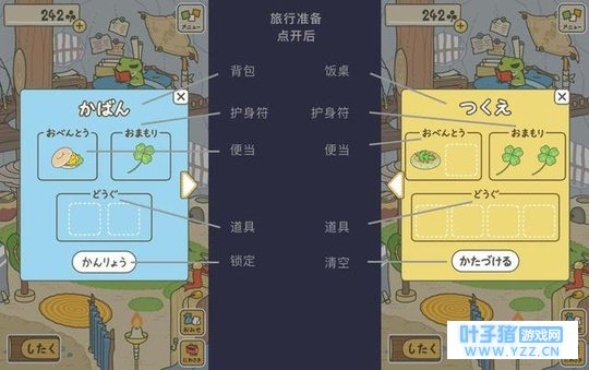 背包:蛙去旅行时会带走的包 饭桌:蛙去旅行时依然在家的饭桌,蛙不在的时候可以在饭桌上准备蛙以后去旅行需要的物品,不需要你移动到背包去,蛙会自己带走。 小心别点到清空哦~ 物品界面