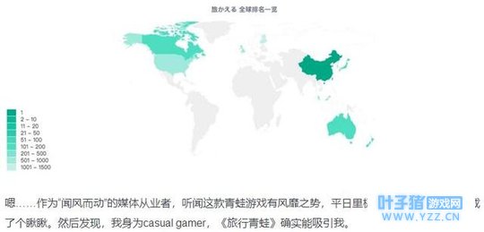 1月10日起搜索“旅かえる”关键词,该游戏在中国App Store排名显示已位居第一,搜索量激增。1月21日6点起,青蛙游戏获得了应用和游戏双榜第一,截至发稿仍旧霸榜。除中国外,日本是该游戏的第二大市场,应用总榜位列第99名。另外,美国、韩国、加拿大、澳大利亚等地区也有下载量,但数量相对比较少。