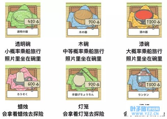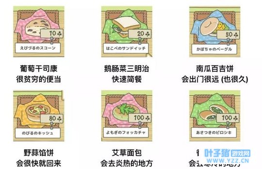 商店 从右下角的入口进入商店,在这里可以买到的东西分为三类。每次行李中带的物品影响了它会去哪里,多久回来。