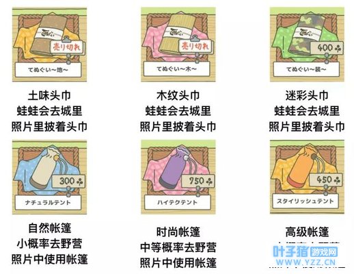 「道具」 :不同种类的道具对蛙蛙的旅行有不同的引导。