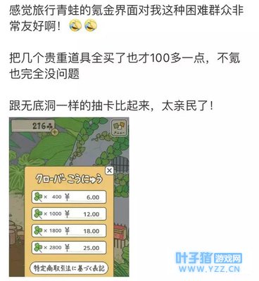 青蛙出门旅行的之后,玩家在这个过程中无法干预青蛙旅行的路线,也无法进行交流,青蛙寄回来几张写真、写真里是否出现其他游戏角色(青蛙的旅行小伙伴)全看概率。 更重要的是玩家无法决定青蛙出门的时长。青蛙出门旅行后,现实时间中青蛙会消失两三个小时至三四天,这期间玩家除了收割一下院子里的三叶草,能做的只有等待。 玩家看着青蛙自己吃饭自己旅行自己走走停停,开始怀疑自己存在的意义。事实上除了最开始为青蛙取了个名字证明了存在感,玩家进入游戏后基本丧失主控权,有网友称,青蛙在没有玩家的情况下,也能完成自给自足。 但或许也是这样,《青蛙旅行》才会以一种“佛系”的姿态迅速走红。游戏削弱了玩家的作用,反过来想,玩家也不需要在这款游戏上花费太多时间与心思,这是《青蛙旅行》与其他手游截然不同的地方。《青蛙旅行》没有抢占玩家时间与资金的野心,或者说所有诱使玩家进行资金投入的设置都十分隐性,氪金能使青蛙旅行过程更华丽、带回更多特产,但不氪金青蛙依然会寄回照片与礼物,并不影响玩家游戏体验。青蛙如同平行世界一个冷淡疏离但又温柔的朋友,玩家是个有礼有节的观望者,彼此无负担,各自随缘。