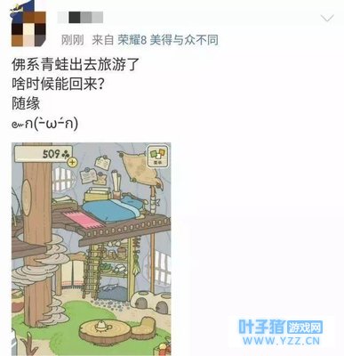 没错,继【恋与制作人】这款手游火爆之后,朋友圈里最近又火速流行起了一款名叫《旅行青蛙》(日语为旅かえる)的手机游戏。 旅かえる/ 这是一个典型的佛系游戏,只有院子和屋里两个场景。 在这个游戏里,你会领养一只青蛙,它可能会出门,也可能宅家,还可能出去旅行、给你寄明信片带手信。 你只需要定期收割门前的三叶草,给自己的心肝宝贝蛙准备好食物和行囊就可以了。 接下来他便会安排好自己的行程,而你只需要安心地当佛系玩家。 就是这么安详宁静、岁月静好,画风还十分治愈。