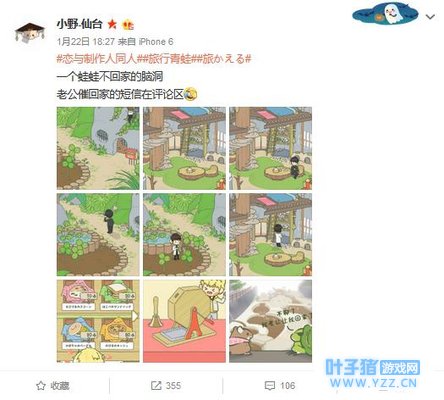 ③还有更厉害的玩家,结合了这两天大热的游戏《旅行青蛙》,成功推出了一系列再创作的小漫画。