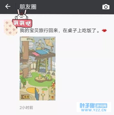 但攻略只能部分引导蛙的行为,即增大蛙某些行为的概率,却不能决定蛙的行为,即使都按照攻略上的办法来,不同的玩家还是会养出行为方式截然不同的青蛙。 让每只蛙都变得独特有个性,这可能才是游戏最大的魅力所在。 在玩家心中,无论我的蛙乖巧(父母在不远游,游必有方),还是浪回来还知道给马麻带好多精美的明信片和好吃的。 或者叛逆(每天不见影踪,回家两手空空),好文(喜欢读书写字),还是好武(削木头削个不停)。 热爱社交(寄回来一大堆和小蝴蝶、小螃蟹、小老鼠的合影),还是性情孤僻(从没见过一张和小伙伴的合影,院子里只来过那只贪吃的蜗牛,孩子还没让人家进屋)。 是自拍高手(全正脸,美美哒),还是直男审美(在照片中远到不能再远、小到不能再小的地方发现了蛙的背影),它都是属于我的、独一无二的小“生命”。 它像一只小精灵,活在我们的手机里,也活在比手机屏幕更大的无限想象空间里,它活成了我们手机深处的一份牵挂。 我们何以对它如此牵挂? 大概养蛙给了我们一种如同“为人父母”般的感觉。 我们照顾蛙蛙的饮食起居、看它出门、盼它回家,看着这个小生命在眼前成长,感觉真的好像养了一个可爱的孩子。 而且我们还能替它起名字。说到名字,小编已经拜倒在许多蛙蛙父母丰富的想象力下: 普通父母:呱呱、呱娃子、宝贝儿子、走丢的孩子。 文艺父母:当归、戈多(等待戈多)、时雨(黄梅时节家家雨,青草池塘处处蛙)、屈原(因为它经常“披发行吟泽畔”)、苟且(希望它多去追求诗和远方,不要总在我眼前苟且)。 逗比父母:“本来叫吴彦祖的,但是它出去老是不带东西回来,改成了争气蛙” 、你的不孝子/你的少女心(于是经常能收到系统消息:“你的不孝子/你的少女心”回来了、“你的不孝子/你的少女心”旅行去了)。 花痴父母:所有你们能想到的国民老公们的名字…… 我们养蛙时的心态,就像真正的父母一样。当它宅在家久了,怕它闷得慌,看它烦得慌,嫌它整天闷在家里没出息,担心它没朋友,希望它出去走走。 可当它到了外面,没有音讯的时候,又想念和担心起来:我蛙在哪里,过得好不好,有没有饿着冻着,它在干什么,它有没有想我……它好几天没回来了,是遇到坏人了吗?