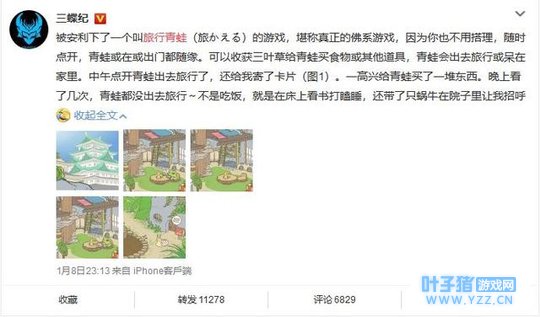 3.滚雪球一般的下载量增长还要归功于玩家自传播 不过,《旅行青蛙》能够刷爆社交媒介的最大原因, 在于它基于独特的玩法和“佛系”特质上的玩家自传播。 《旅行青蛙》在去年12月6日上线,不过一开始在国内市场并没有掀起多大的风浪。根据App Annie的数据统计,从排名曲线可以看到,《旅行青蛙》从1月8日开始排名持续上升,并于1月20日登顶App Store免费榜。 那么1月8日这天发生了什么呢?笔者在微博搜索“旅行青蛙”看到,在1月8日这天,微博红V用户“三蝶纪”发布了一条关于《旅行青蛙》的微博。