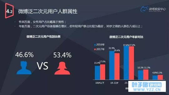 《旅行青蛙》作为一款佛系养成类游戏迅速激发了养成系市场的巨大的潜力。而在不久前,偶像男团养成类综艺《偶像练习生》上线时,也曾以近2亿的播放量触动了养成系市场。 除了《偶像练习生》,《创造101》、《这!就是街舞》等综艺也将成为各大视频网站的头部自制内容即将上线,而这几档综艺都在偶像养成方面有所侧重。 2018,将正式开启“养成文化”元年。 《旅行青蛙》用户以95、00后为主 养成模式对准女性市场 《旅行青蛙》最初是在微博、B站逐渐蹿火,进而蔓延至朋友圈。那么根据B站、微博的用户画像也可大致看出《旅行青蛙》的用户群体。 据B站董事长陈睿透露,截至2017年9月,B站活跃用户已超过1.5亿,其中24岁及以下的用户占到90%以上,而0-17岁的用户为绝对主流。 《2017年微博二次元用户洞察报告》也显示,微博二次元用户群体中,22岁以下的人群占比在46%以上,将近一半。据了解,截至2017年9月底,微博日活跃用户已达1.65亿。