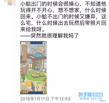 旅行青蛙这款游戏,最大的特点是十分佛系。养蛙之后,就像养了一个孩子一样,它出去玩时担心食物够不够,回来时会不会给我带回来明信片,怕他饿着但他却一直在看书,喂饱了又担心会不会生病。
