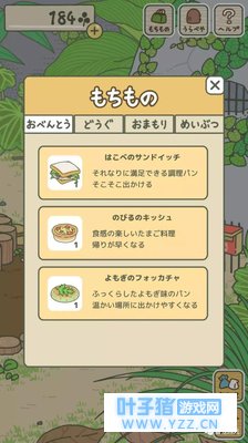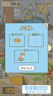 5、【屋内】最核心的功能就是左下角的【准备行李】。其中蓝色页面为【背包】,黄色页面为【桌子】,背包是青蛙儿子下一次会带走的行李,选择好以后按右上角X确定保存, 切记千万不要点下面的那个白色收回按钮,一点东西都取消了 。
