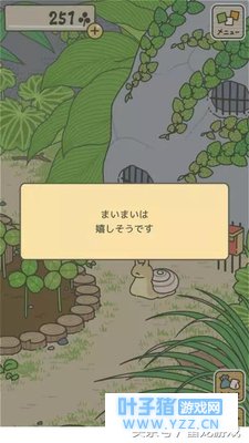 2、庭院内的田地,随时间长出三叶草, 每三个小时会长满 ,日常采集三叶草作为货币,可以用来给青蛙儿子买东西。偶尔掉落的四叶草作为一次性护身符使用。 3、庭院内右上方为【主菜单】,点开可以打开【现有物品】、【记录】、【帮助】三个子菜单。右下方为:【购买物品】和【进入屋内】