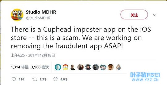 来自《茶杯头》官方的推特——“在iOS商店,这是一款仿冒《茶杯头》的应用——这是一次骗局。我们正在努力让苹果尽快下架这款有欺诈性的应用!” 对于玩家而言,类似这样的山寨品势必会混淆他们的视线,而对于原作开发者而言,山寨品则会很大程度上影响他们的流量和收入。或许,苹果有必要加大对山寨手游的打击力度了。 关注微信公众号“游戏葡萄”,每天获取最前瞻的游戏资讯 |