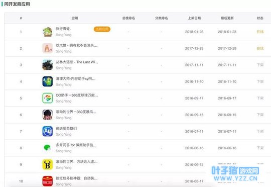 而葡萄君在搜索该游戏同开发商的其他应用时还发现,这位名为“Song Yang”的开发者还是位“山寨达人”。如下图所示,该开发者还开发了《丛林大逃杀 - The Last Winner》、《以太猫》等手游,模仿目标覆盖大逃杀、区块链猫等领域。在早期,他还曾推出“抢红包外挂神器”、“多开问答”等辅助工具,不过目前都处于下架状态。在所有的APP中,还在线的只剩下刚刚上线不久的《以太猫》和《旅行青蛙.》。