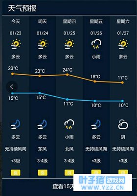 接下来还可以看到更多的实时信息,它给出了详细的“逐小时预报”,这样用户就可以对照着拿捏好时间做活动安排了。 当然,除了每小时的预报之外,它也少不了每天的天气预报情况,在小程序中,它最多可以预告未来15天内的天气情况,包括温度,风力,空气质量等。