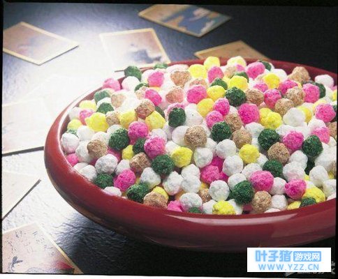 五色豆是指染了五种颜色的糖豆,是京都的著名点心之一。五色豆需要先将豆子炒熟,然后包裹上五彩色的糖衣,颜色主要是白、青、红、黄、黑,其中白色代表金,青色代表木,红色代表火,黄色代表土,黑色代表水,合起来就是大地的象征。(美少女战士么???~)