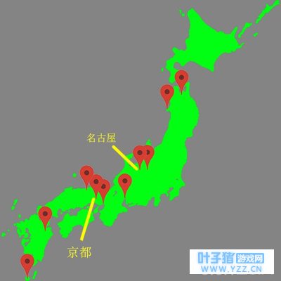 最后,我们把呱去过的地方在地图上标记一下就可以发现,呱的活动范围在本州岛上比较集中,而且在京都和名古屋附近活动特别频繁,离京都远的地方就很少去。