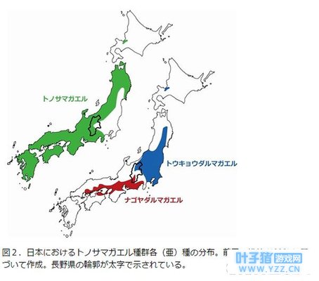 那我们就知道了,游戏中的青蛙极有可能就是生活在在京都和名古屋附近。那我们就参照这个日本青蛙的分布图来看看我们家的呱是个什么品种。