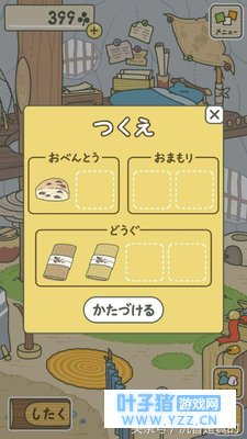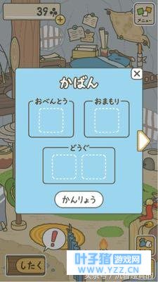 点选左下角木头图案” 支配”(したく)可以帮青蛙收拾包包,蓝色介面是包包(かばん)。包包里面一定要有的物品是便当(おべんとう),便当只能使用一次。护身符(おまもり)跟道具(どうく)不一定要有,护身符也是一次性的,道具则是永久性的。收好包包之后就按最下面的完成(かんりょう)就可以等着青蛙出去玩喽! 注意: 若支配是一个惊叹号,代表包包没东西!