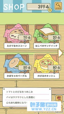 点选右下蓝白袋子按钮可以进到商店(おみせ)。商店内卖了食物/永久型护身符/道具等等,四叶草只能用收集的或是蜗牛会给。