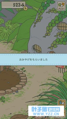 青蛙在家或不在家的时候,蜗牛/蜜蜂/乌龟都有可能会来家里玩(一开始只有蜗牛)~可以按一下蜗牛喂它吃名产,他会很开心。来的时候可以点信箱收到一封抽奖券(要看广告,需要联网使用),朋友回家的时候可能会得到三叶草/四叶草。