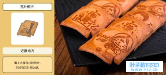 这是一种用砂糖调味的瓦形干烤甜煎饼,煎饼表面大多有用烧制的焦痕描绘出的图案或文字,看上去像瓦片,实际上香脆可口。 · 硬煎饼 ·
