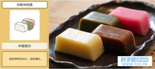五平饼是中部山区的特色食物。将粳米饭研烂,团成圆饼后串在签子上烤制而成,微焦是它最好吃的状态,酥脆的外表下是软糯的心。 · 外郎米粉糕 ·