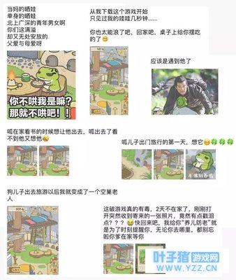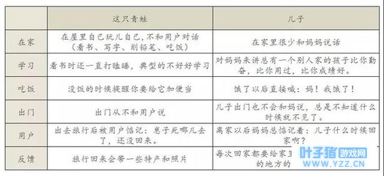 这也说明了广大用户对“晒娃”这种行为的抵抗力是最低的。 由此可见极低的 用户参与门槛 加上这种 “晒娃”行为 成为了这款游戏具备强自传播力的两大因素。 为何用户会把蛙当儿子养我们来对比一下这只青蛙的主要行为和儿子的行为是不是很类似。