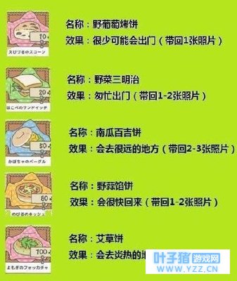 三叶草 在商店选项中有便当和道具卖,可以用三叶草购买。不同的便当也道具价格不一样,不同的便当和道具组合在一起,也会决定了你的青蛙儿子每次旅行地点和遭遇的不同(献上来源于网络的部分汉化图)