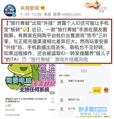 今天据下午央视资讯微博爆料:风靡朋友圈的旅行青蛙出现外挂,不仅能够泄露个人ID和隐私,甚至还能够让手机变成板砖。这一切都是因为购买三叶草而引起的不法网购商通过低价售卖,玩家安装“外挂”后会出现手机数据丢失和ID丢失,刷机也不好用。最后提醒下:蛙不嫌弃家穷,请通过正确方式赚取三叶草。