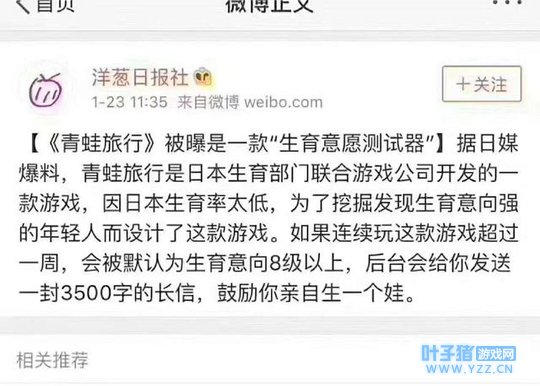 一小心除了车祸 让你疯,让你去放纵....... 让你飞,让你出去浪....... 这下歇菜了! ===========我是说正经事的分界线=========== 这样一款又萌又自愈的游戏,你知道她的设计初衷么? 据洋葱日报社报道: 【《青蛙旅行》被曝是一款“生育意愿测试器”】据日媒爆料,青蛙旅行是日本生育部门联合游戏公司开发的一款游戏, 因日本生育率太低 ,为了挖掘发现生育意向强的年轻人而设计了这款游戏。如果连续玩这款游戏超过一周,会被默认为生育意向8级以上,后台会给你发送一封3500字的长信,鼓励你亲自生一个娃。