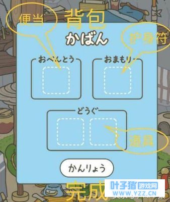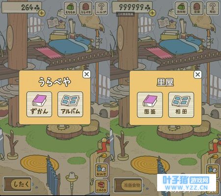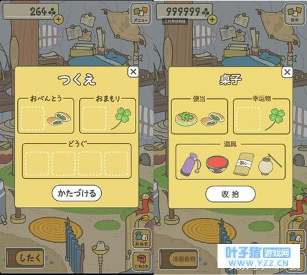 3、进入【家】里面便是小青蛙住的地方,小青蛙没出去旅行就会在它的床上看书,想让他多点去旅行的话就多点在左下方的【准备食物】中准备小青蛙的便当、幸运物、道具等吧,所有的物品都可以在【商店】买到,具体清下猿仔罗列的各种物品中日文左右对比吧。