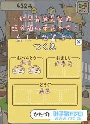 提前准备合适的装备 远门旅行你的蛙要带很多的东西,什么帐篷呀碗呀,或者是其他的装备,然而如果是你忘记了给你的呱装备的话,比如说它的桌子上没有东西,它的背包里也没有东西的话,你的蛙可能就回不来啦!