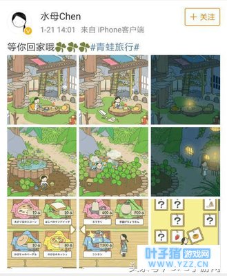 经过阿梦一番探究,终于发现了这个融入游戏界面毫无违和感的小女孩,竟然是出自画师-水母chen的作品,并且微博上面有原画的发表。 阿梦的内心是惋惜的又是赞叹的。 首先:毫无违和感,不管是从画风还是形象上,都跟旅行青蛙十分融洽。 其次:到后期解锁一个新人物出来,从游戏的角度并没有毛病。 但是深究之下,确实有不妥之处,日本的游戏,出现一个中国风的小女孩,逻辑上解释不出来,然后第一张图,小女孩吃早饭,不太符合日本人早餐吃寿司的习惯,罗宋汤的样子可能更符合韩国吧。当然,小女孩在泡温泉旁边放着的小酒壶就很符合日系风格。 虽然是一场乌龙,但是阿梦还是要很感谢水母Chen能画出这么优秀的作品,让阿梦这个老母亲对自己的呱儿子多了一份遥远的期待。