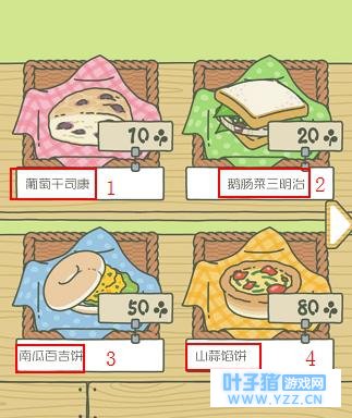 食物篇 不同的实物对应的青蛙出门的时间和收获都是不同的 1、葡萄干司康:小蛙出门的概率较小,出门的话一定概率带回来1张照片 2、鹅肠菜三明治:匆忙出门,带回1~2张照片 3、南瓜百吉饼:出远门,旅行时间会变长,带回2~3张照片 4、山蒜馅饼:短途旅行,缩短出门时间,带回1~2张照片 5、艾嵩油面包:会去比较炎热的地方 6、胡葱炸面包:会去比较寒冷的地方
