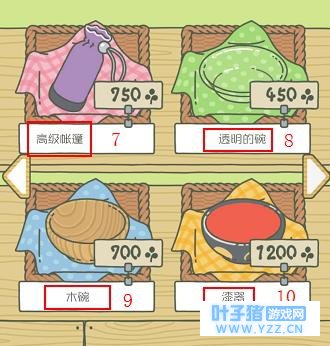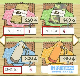 道具篇 2、3、4头巾:带着这三个头巾的话蛙会去城里,带回来的照片也会披着不同的头巾,分别是土色头巾、木纹头巾和迷彩头巾 5、6、7帐篷:带上帐篷后蛙儿子会去野营,并且帐篷也会在照片上表现出来。根据价钱不同,野营的概率不同,自然越贵的概率越大。 8、9、10碗:对于人来说是碗,对于蛙儿子来说就是船了,带上后蛙儿子一定概率会乘船(碗)旅行,照片上蛙儿子会坐在碗里,自然也是越贵的概率越大。