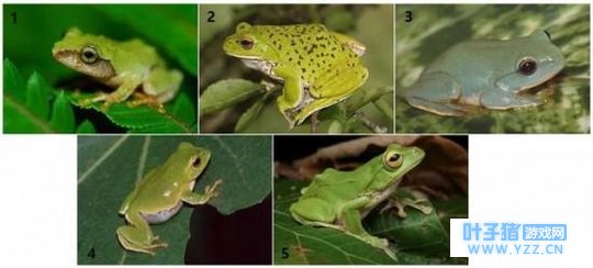 5种绿色的日本树蛙。图1:琉球原趾树蛙(Kurixalus eiffingeri),拍摄者白欽源;图2:森树蛙(Rhacophorus arboreus),拍摄者Alpsdake;图3:奥氏树蛙(R. owstoni),拍摄者:Peter Janzen;图4:施氏树蛙(R.schlegelii),拍摄者Peter Janzen;图5:绿树蛙(R.viridis),拍摄者Okinawa Nature Photography。 它们体长从2.5到6cm不等,背面多数呈鲜亮的草绿色,少数个体背面具有深色的斑点或花纹。依靠指、趾末端均的发达吸盘,这些树蛙可以轻易贴附于光滑的墙面,更不用说爬上树枝这么简单的事了。另外,多数种类的树蛙除了在繁殖期聚集于水边活动外,其余时间多分散于丛林的各个角落,很符合呱儿说走就走的性格。 似乎种种迹象表明呱儿是某种树蛙?有一点对不上:树蛙科的物种主要栖息于相对温暖的热带、亚热带地区,这5种树蛙里除了森树蛙和施氏树蛙的分布北限可达日本本州南部以外,其余3种均主要分布于日本南端的九州及冲绳地方。由于自身喜暖畏寒的原因,树蛙很可能不能像游戏中“呱儿”那样逍遥走四方了,但下面介绍的雨蛙却可以。 雨蛙?八成是了 日本的雨蛙只有两种,分别是哈氏雨蛙(Hyla hallowellii)和日本雨蛙(Dryophytes japonicus)。 哈氏雨蛙分布于日本的琉球群岛,体长约3cm,通体呈草绿色,在眼鼻之间多有浅色线纹,指、趾末端也生有吸盘,但和前面的各种树蛙一样,也不能适应相对寒冷的气候,故此排除。