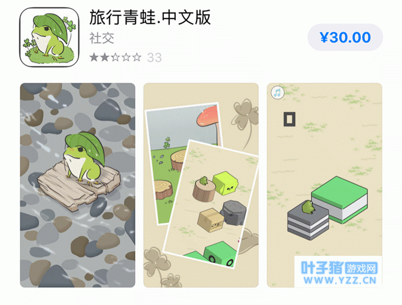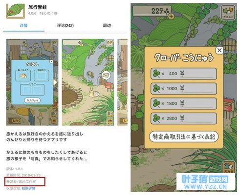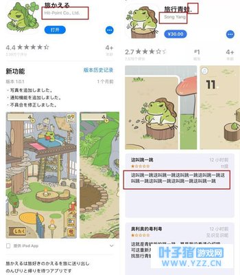 官方正版(左)和山寨版(右) 今天下午,下文已经搜索不到《旅行青蛙.》了,但App Store中蹭热度的高仿游戏仍不少,其中又有一个要价30元。