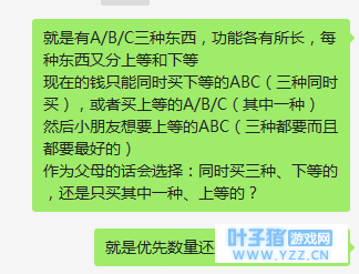 抛开游戏攻略这一点,如果是养娃,那么当爹妈的在经济能力有限的情况下,是会降低质量要求,尽可能地满足数量要求呢?还是先尽量买最好的,一样一样地凑齐“顶级装备”呢? 【不是很懂我一个十九岁的单身狗想这个干什么】 朋友的想法是“再苦不能苦孩子,既然要买就要给它最好的”。我的想法是先买最便宜的以最快速度收集齐不同的道具,有钱(三叶草)之后再重新买更好的同类型道具。 我决定去问问那些真正当了父母的前辈们怎么想。 问题大概如下图。