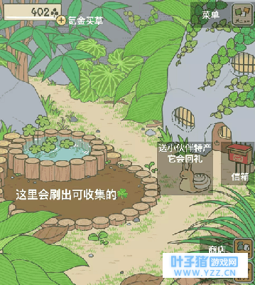 打开游戏,我们便进入了院子。我们可以在水池边收集三叶草,这是这个游戏里的货币。 有时候,蛙蛙在旅行途中遇到的小伙伴也会来做客。你可以送他们蛙蛙带回来的特产,他们稍后会送你三叶草作为回礼。 ▎商店