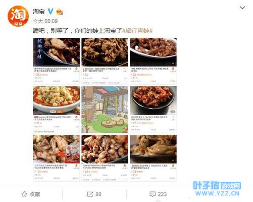 而万能的“淘宝”就不一样了:睡吧,别等了,你们的蛙上淘宝了。晒出的是淘宝上各种和“蛙”有关的各种美食,对于吃货们来说,确实好吃的比什么都更重要,旅行什么的都没兴趣。