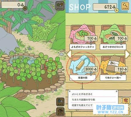 食物比较简单,庭院收集三叶草,用三叶草在商店买食物; 护符的类型有两种,一种是提高幸运值,让青蛙能够带回更多东西;另一种是提高青蛙旅行前往某个地点的概率。 第一种类型的护符又有两种,分别是四叶草和幸运铃铛,四叶草是通过朋友赠送或者收集三叶草获得,为一次性消耗品;幸运铃铛,在商店花费3000三叶草购买,为永久性物品。