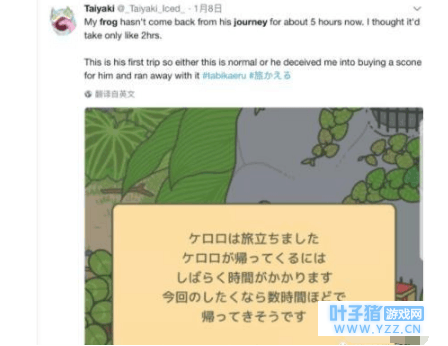 画风特别萌,不仅国内,在欧美也非常流行。 大概就是,给青蛙准备行囊,他会出去旅行,然后游记明星片给你。 然而……………… 国内的朋友都觉得这哪里是青蛙之旅啊,这是佛系养青蛙啊!!! 虽然是一只旅行的青蛙,但是让很多人感觉自己当了妈,特别身边的女孩子,爱不释手,上班时间都要拿出来看看,儿子青蛙干嘛去了。 这款游戏有点像养成类游戏,给青蛙取个名字,让后让他去旅行 游戏中需要搜集三叶草,当做货币,然后给青蛙买食物,准备装备,然后他就自己去旅行了。不同的食物,会产生不同的效果。 一旦小青蛙出去玩了,发现青蛙不在家,当妈的焦虑就上来了。 食物不够怎么办,装备都没准备好,他出去是不是吃苦了,哎呀心里好挂念他。 新作原名中的“かえる”除了有青蛙的意思,也代表了动词“归来”,其意蕴不言而喻。 一些玩家表示如下: 我的儿子出门几个小时了,好担心他