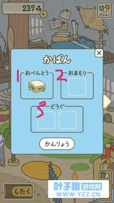 黄色的框是桌子,放的框和背包一样,是备用的包,并不会显示物品在场景的桌子上!!当哇从外面回来,而你不在的时候,他会自己把桌子上的东西放到包里,下面那个按钮是重置,按了所有放好的东西都会被重新收起来 二*商店物品* 【除了食物,商店里的旅游道具都是买一次永久使用的!!!】