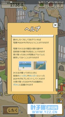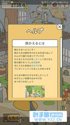 青蛙的旅行会给你带来照片和礼物,在收到的照片里你可以看到青蛙所在地的样子,拍下的照片可以保存入它的相册 青蛙回来的时候,会因为目的地的不同,送给你不同的礼物,新的礼物会自动保存在图鉴里面