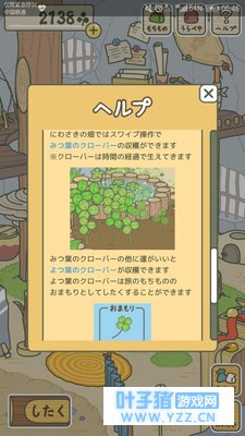 五*三叶草和氪金* 在长出的三叶草上滑动来收获, 有可能会收获到四叶草; 三叶草的生长是自行随着时间不断进行的;【不用你种植】 四叶草可以带来好运,但是产量很低,但是他可以作为旅游的护持物来祝福你,你可以看到,商店里的东西是可以用三叶草来购买的 【※除了四叶草】