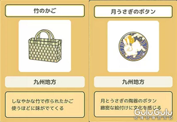第九个特产是竹编的篮子,看起来没什么稀罕的,考虑到青蛙君是从九州带回来的,我估计它可能是把人家装温泉蛋的篮子给顺回来了,毕竟九州那边温泉很多。 第十个特产也是从九州带回来的“月兔纽扣”,日本的月兔和中国的玉兔传说差不多,只不过我们的兔子在月亮上捣药,他们的兔子在上面捣年糕。带月兔元素的小摆件也是常见的玩具,没有什么特别的地域风情……大概吧。 来源:咕噜咕噜游戏站 http://gulugulu.cn/